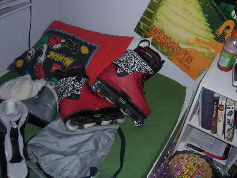 Gen 4 boots dyed red, bandana covered cuff, white buckles(not shown because this was before i realized i didnt have them lol) night one piece souls, black team 5050 frames with white juice blocks, genre wheels and black/red reign neo liner - Black Team 5050s